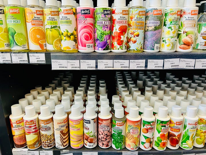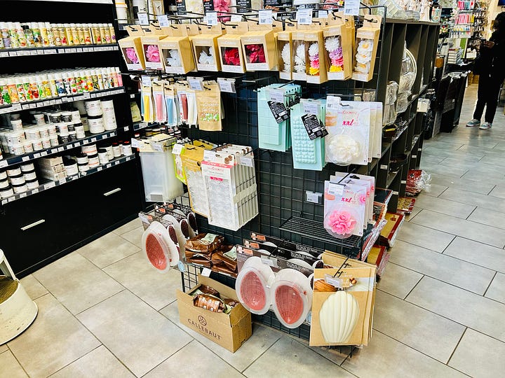 In a recent post, I believe I mentioned that I live in the Marais near Les Halles. There are many wonderful culinary shops in the neighborhood, and sometimes I go inside one of them to look. Someday I’d like to find out what kind of desserts I can make with yuzu, violet, or poppy flavoring. I wonder, does the poppy taste like poppy seeds? Or like the flower? I wouldn’t mind trying to make a madeleine the size of a child’s head (mould pictured above), perhaps for a Proust-themed dinner party. Maybe one flavored with jasmine or rose?