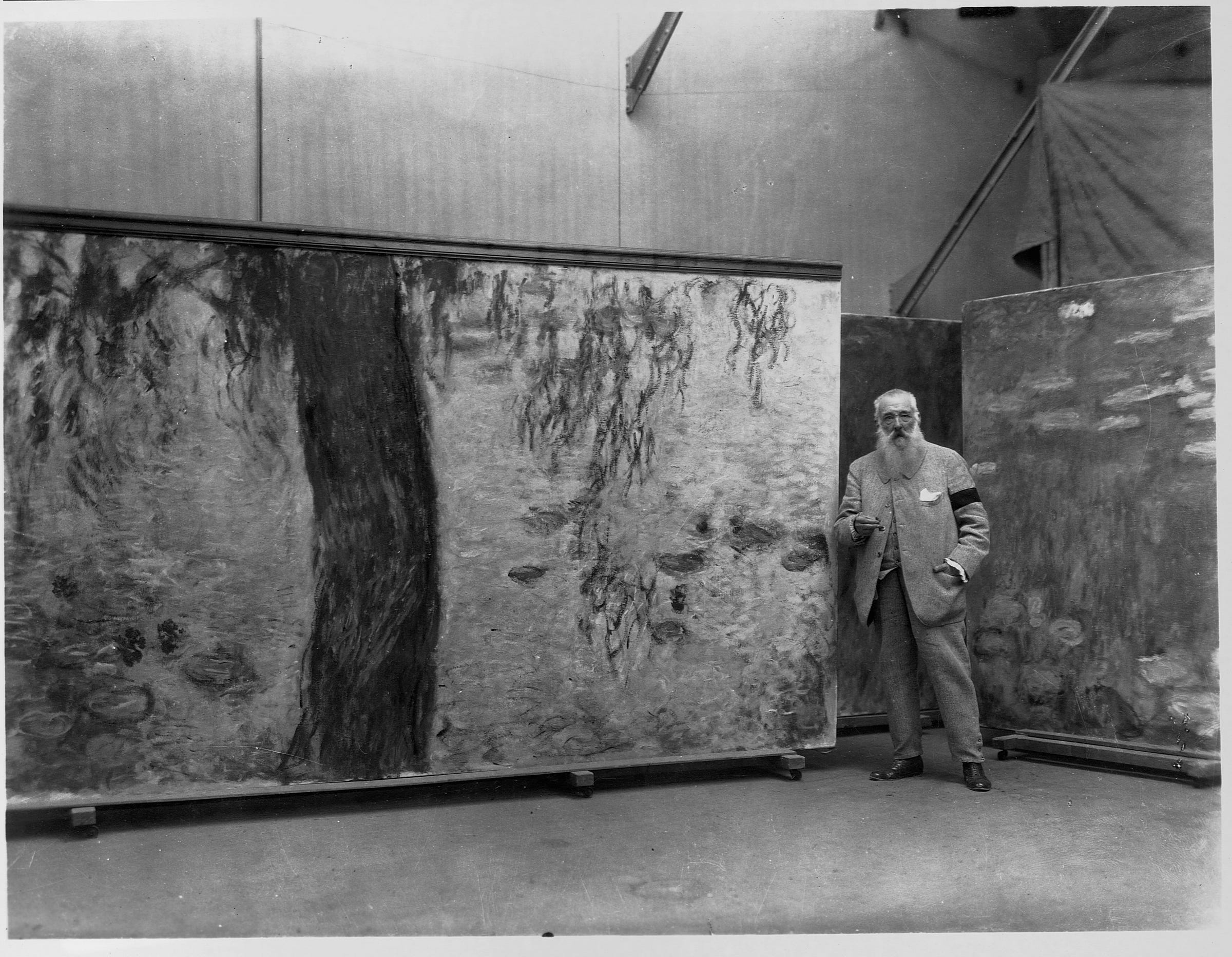 Monet began to paint as if going to war himself. It was a last battle against the dying of the light. He was physically unwell. He suffered from cataracts and cyanopsia, so that everything he saw was tinted blue. Georges Clemenceau, then in between his two terms as Prime Minister, made sure that Monet’s art supplies were well stocked during a time of rations and deprivation, so that he could complete the large works. He encouraged Monet to get cataract surgery, to climb out of his depression. Clemenceau thought the French nation, also grieving, as Monet was, were going to need them.