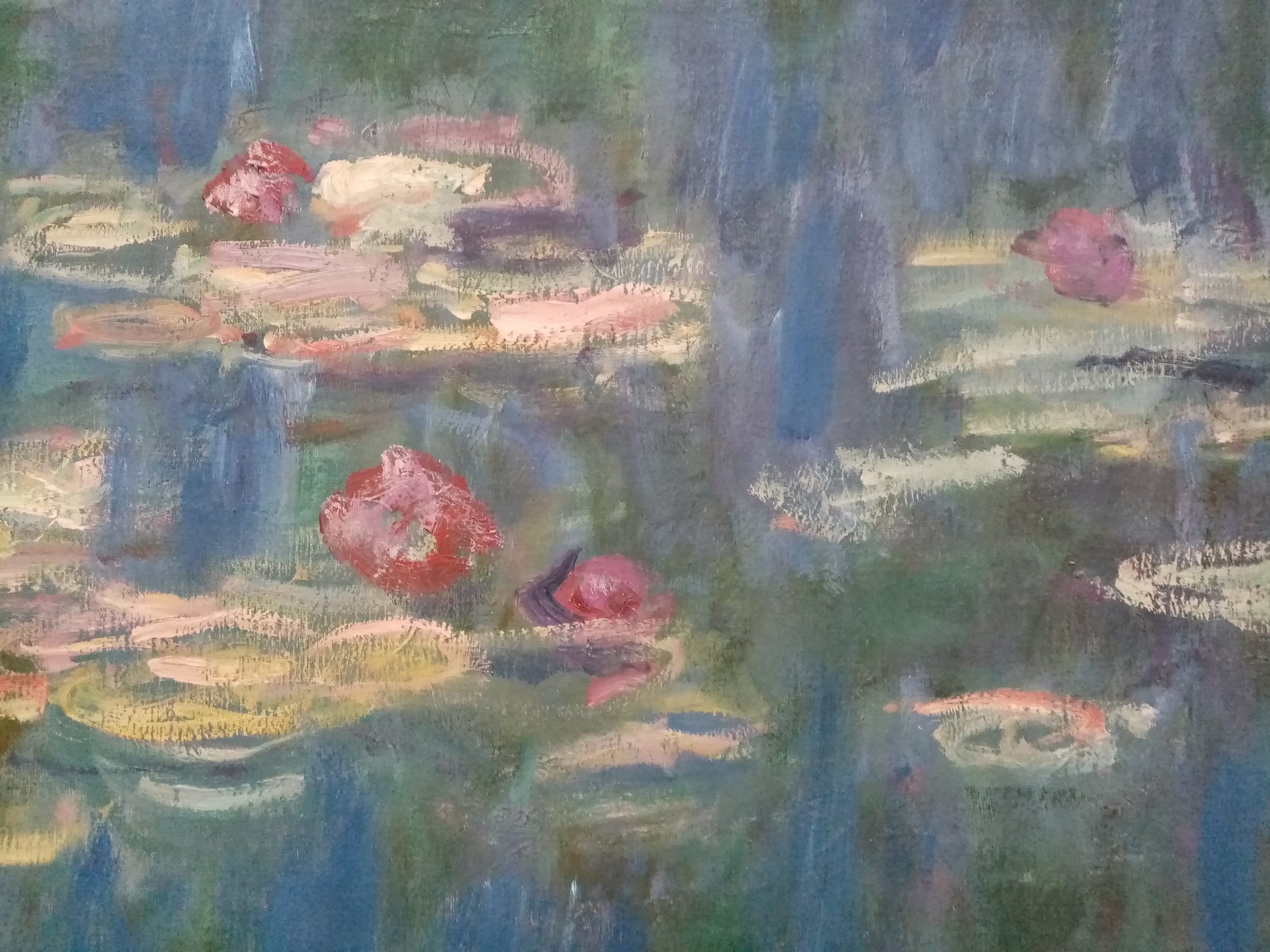 I too had thought that Monet’s water lilies had looked fine-but-sort-of-boring in the commodified reproductions I had seen of them when I was young—the mouse pads and tea towels, the mugs and scarves.